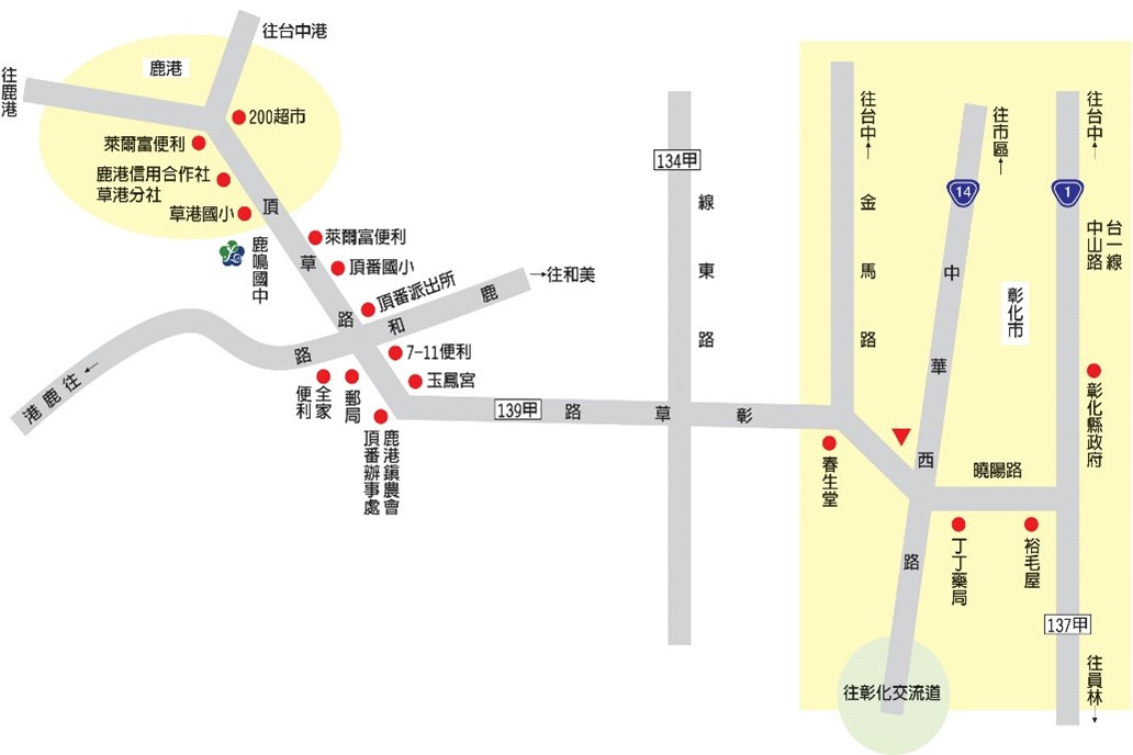 若您從彰化至本校,可不要開到鹿港鎮上,而是直接從彰草路(139甲),相對位置為彰化 — 頂番婆 — 頂番國小 — 鹿鳴國中 — 草港國小 — 草港(由東往西);彰化市金馬路進入彰草路的路口相當複雜,該路口為金馬路、彰草路、林森路的會合處,請不要走錯了 |