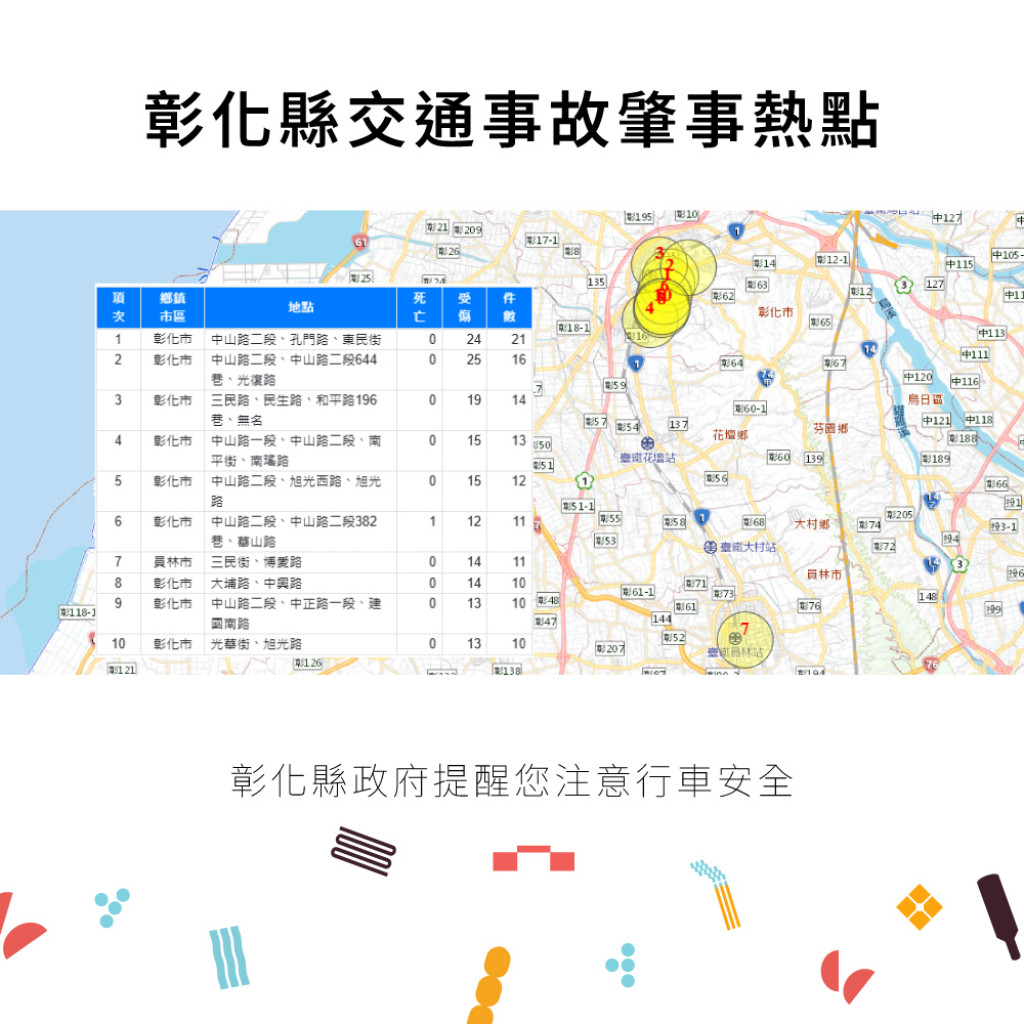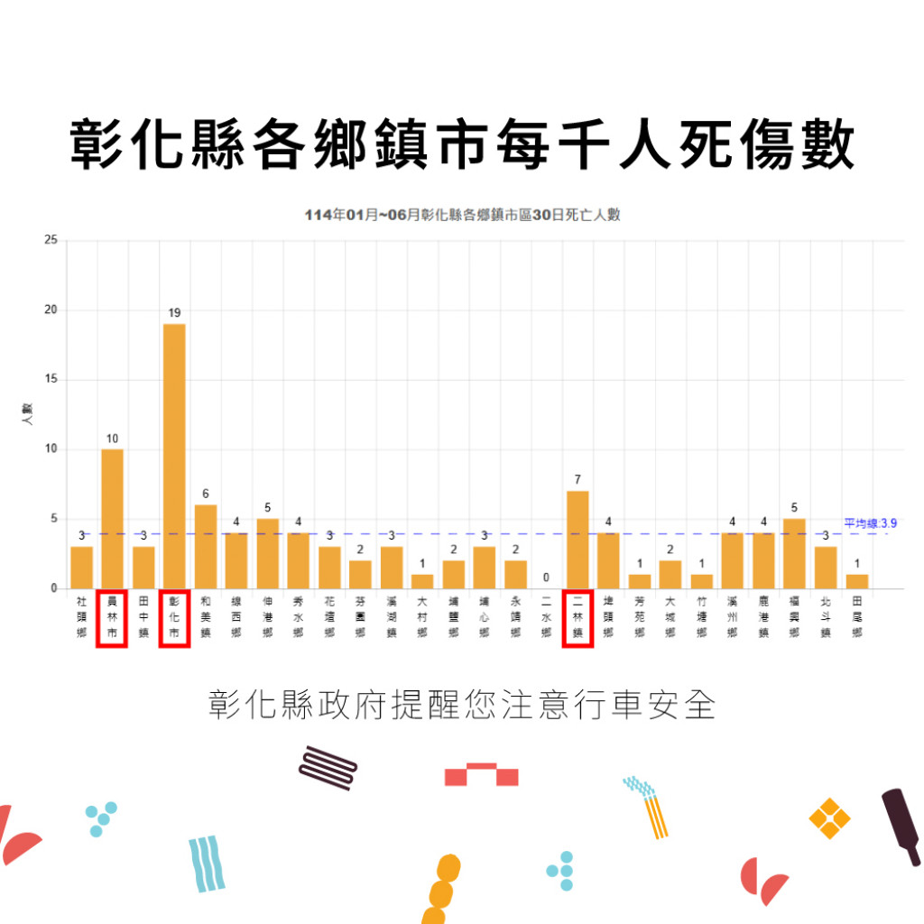 二、根據交通部道安資訊查詢網統計快覽數據跟112年同期比較分析,以少年自行車騎士(含電自、電輔) 事故增加47.7%最高,外籍人士事故增加38.6%次之,自小客車駕駛人增加25.4%再次之。1-6月份30日鄉鎮市每千人死傷人數於「彰化市、員林市、二林鎮」為多,肇事熱點以「彰化市」為多。