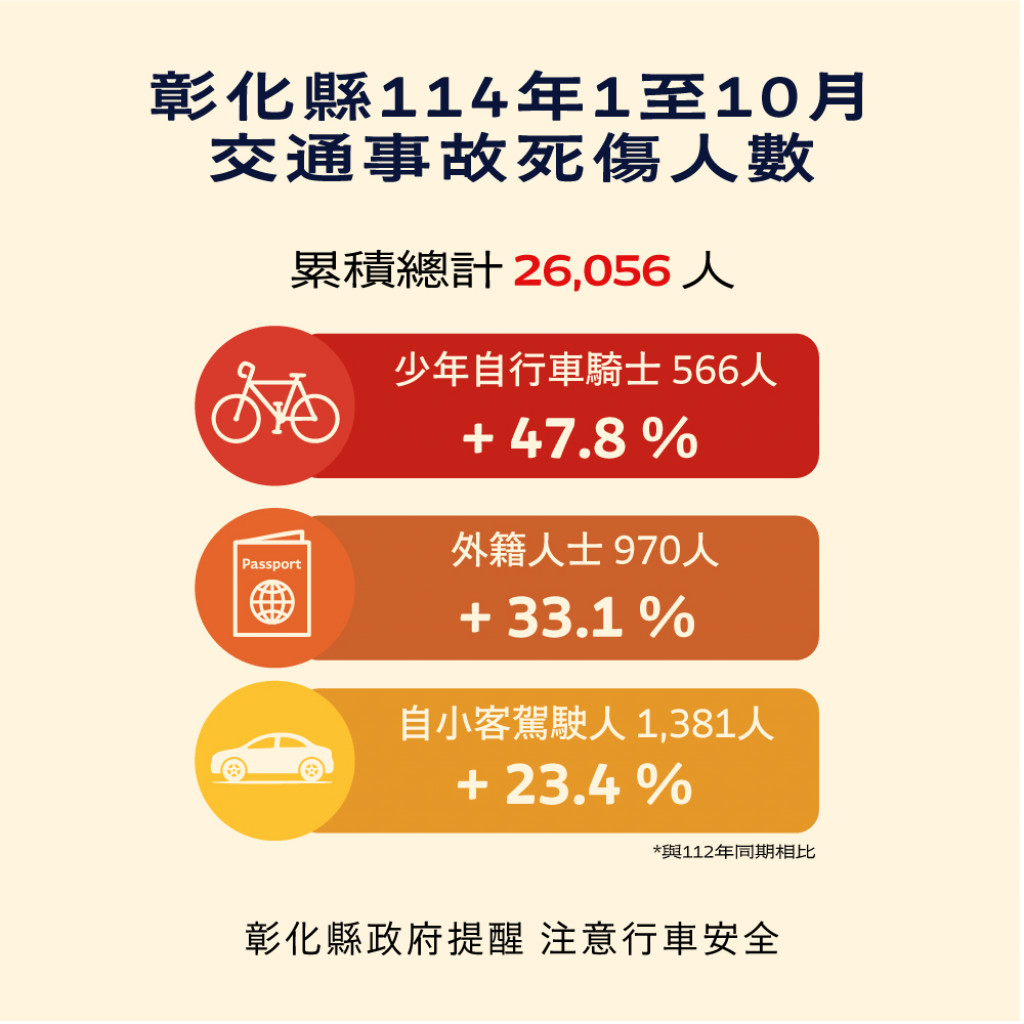 四、附件為「114年1-10月全國道路交通事故統計、彰化縣交通事故死傷人數增加排行、本縣各鄉鎮市30日死亡人數、肇事熱點及交通事故肇因統計」共5份統計資料宣導圖,社群宣導內容可參閱或分享本處「花現彰化-彰化縣政府新聞處」(https://pse.is/8mb444)臉書粉絲專頁,相關宣導圖片素材請參閱:https://reurl.cc/DbyGR5。