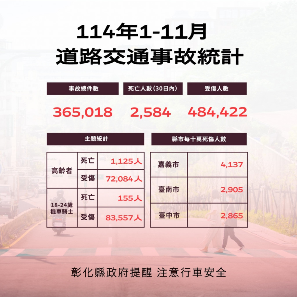 二、根據交通部道安資訊查詢網,本縣114年1-11月道路交通事故與112年同期比較分析,以少年自行車騎士(含電自、電輔) 事故增加46.9%最高,動力機械案件增加28.6%次之,外籍人士事故增加24.6%再次之。1-11月份鄉鎮市30日死亡人數於「彰化市、員林市、鹿港鎮」為多,肇事熱點以「彰化市」為多,合先敘明。