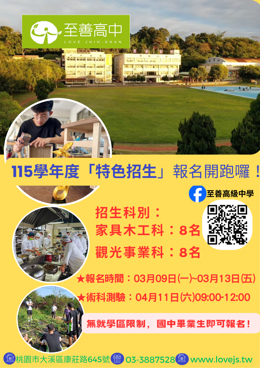 桃園大溪「至善高中」辦理115學年度「特色招生」專業群科甄選入學