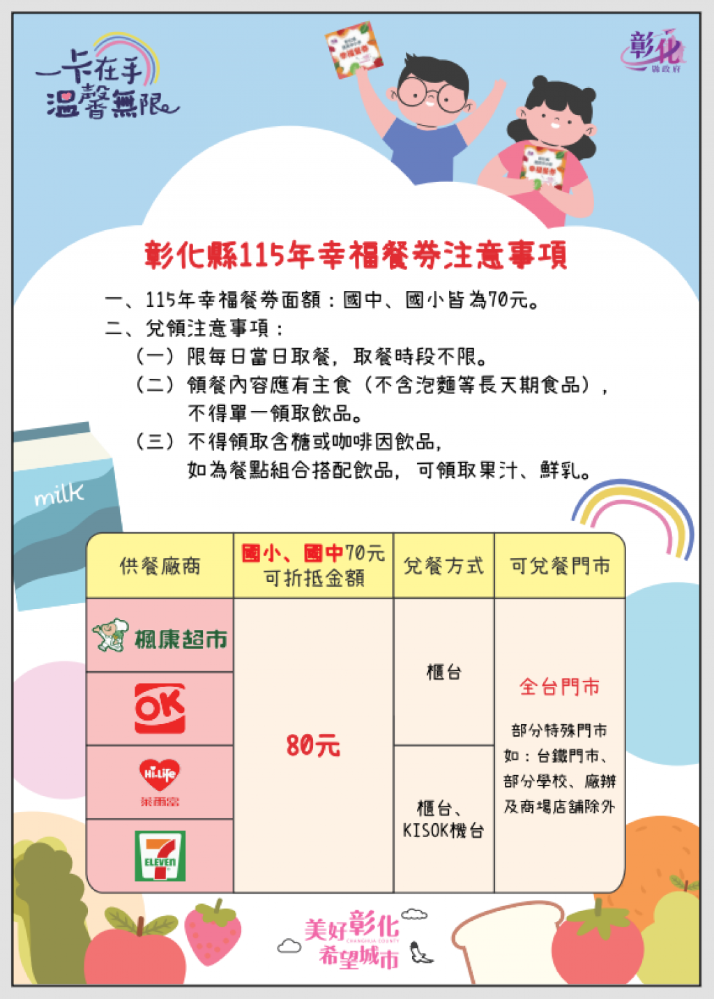 一、115年度幸福餐券供餐廠商名單如下:台灣楓康超市、萊爾富便利商店、來來超商股份有限公司(OK超商)及統一超商股份有限公司(7-11)。 二、餐券面額70元,符合取餐條件之下全店可折抵80元 。可用餐券面額換食便當或套餐組合。 三、檢附「彰化縣115年度幸福餐券注意事項」1份,請參閱!!