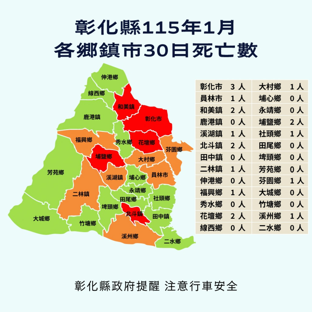 四、附件為「115年1月彰化縣交通事故死傷人數增加排行、本縣各鄉鎮市30日死亡人數、各運具交通事故肇因及肇事熱點」共5份統計資料宣導圖,社群宣導內容可參閱或分享本處「花現彰化-彰化縣政府新聞處」(https://pse.is/8xjc2f)臉書粉絲專頁。